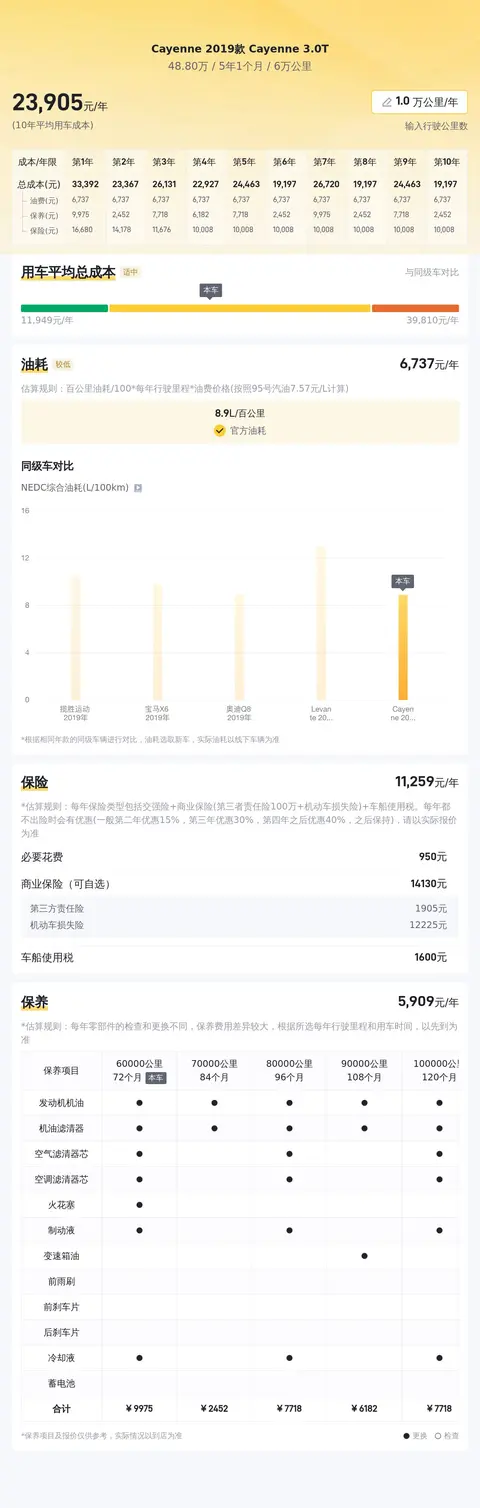 据估算,Cayenne 2019款 Cayenne 3.0T的用车成本是23501元/年,同级车的最低是23501元/年,最高是46710元/年,所以它的用车成本较低。