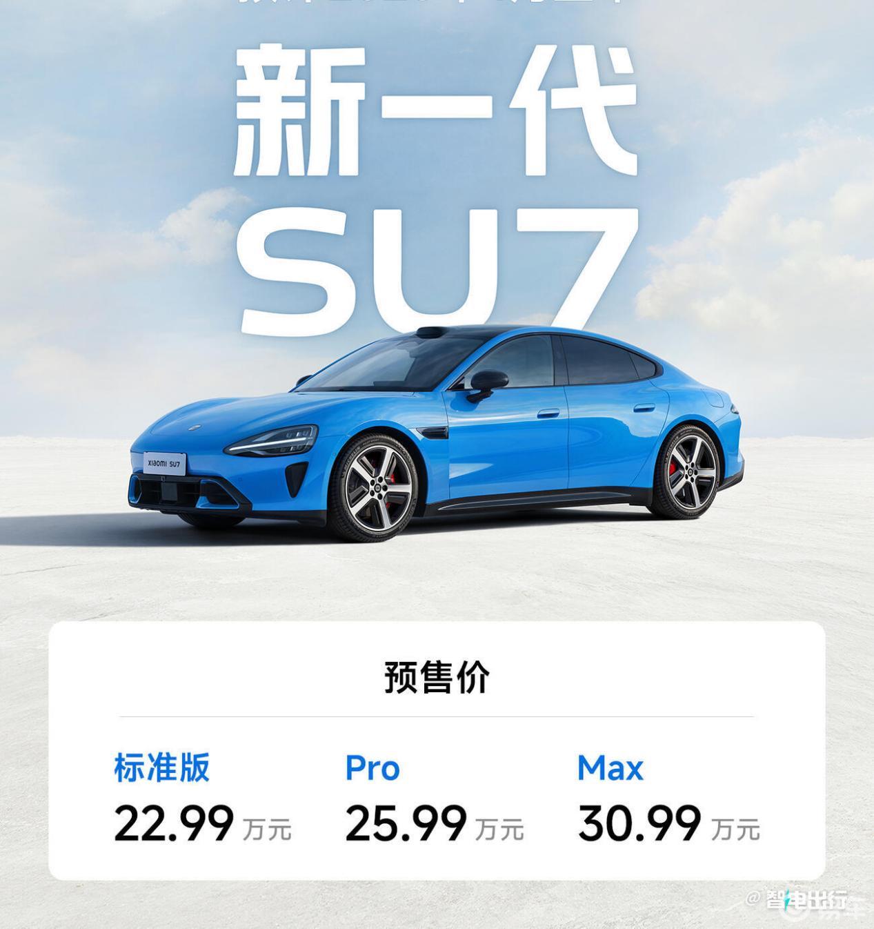 同样定位20万元纯电轿跑,新一代小米SU7也将在19日晚正式上市,此前公布的预售价为22.99-30.99万元,分别标准版、Pro、Max版三个版本,全系标配激光雷达、800V高压平台。