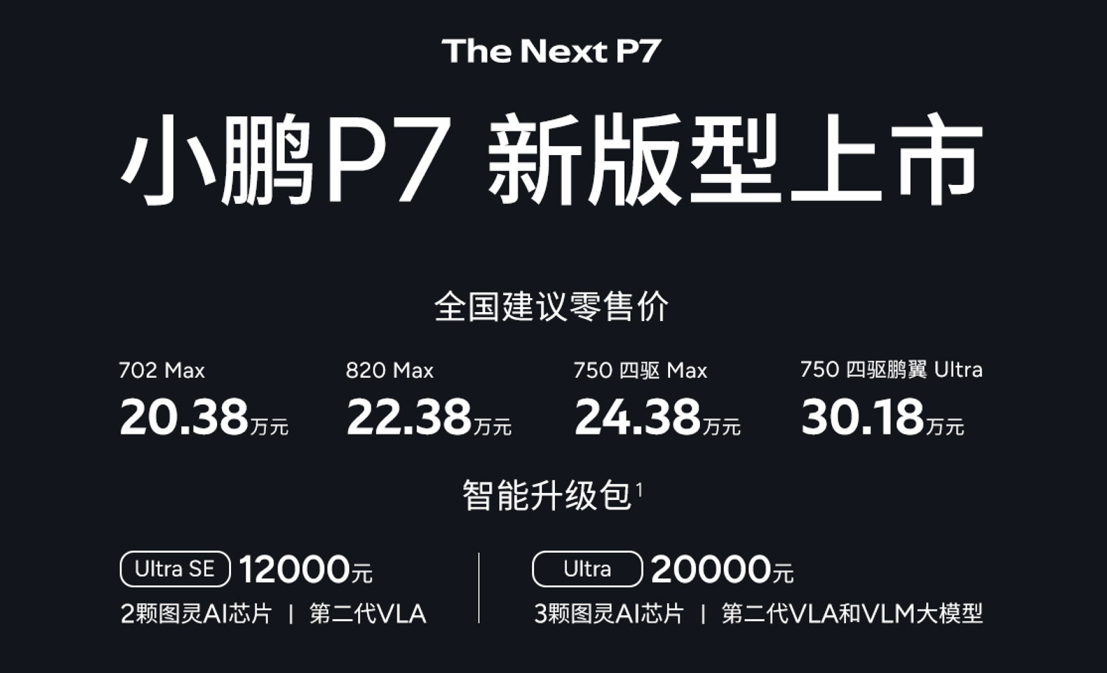 此次小鹏全新P7焕新核心是新增Max、Ultra SE两大版型,重构了产品矩阵,官方指导价20.38-30.18万元,其中702 Max版本20.38万元、820 Max版本22.38万元、750四驱Max版本24.38万元、750四驱鹏翼Ultra版30.18万元。