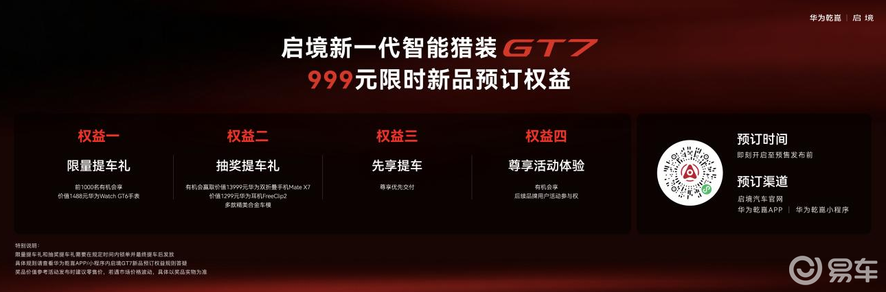 “人生哪有那么多条条框框,只有敢冲敢玩,才够精彩、够起劲儿。” 黄景瑜在现场分享了自己对 “天生玩家” 的理解,并现场扫码下单,成为启境 GT7 首位盲订车主。随着代言人的解锁,启境 GT7 盲订通道正式开启,即日起,用户可通过启境汽车官网、华为乾崑 APP、华为乾崑小程序参与盲订,即可享受限量提车礼、抽奖提车礼、先享提车等多重权益,还能获得品牌上市发布会及后续专属用户活动的优先参与资格,且盲订权益可与后续预售、上市权益叠加享受。其中,抽奖提车礼更是包含价值 13999 元的华为双折叠手机 Mate X7、华为 Watch GT6 手表、华为耳机 FreeBuds Pro2 等重磅好礼,前 1000 名盲订用户还可解锁专属限量福利。
