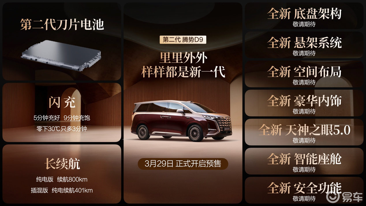 此次预售公布的仅为第二代腾势D9的冰山一角。新车在底盘架构、悬架系统、空间布局、豪华内饰、智能驾驶、智能座舱、安全功能等领域均搭载大量创新与升级,以新一代旗舰标准雕琢每一处细节,实现里里外外、样样皆新的全面进化。