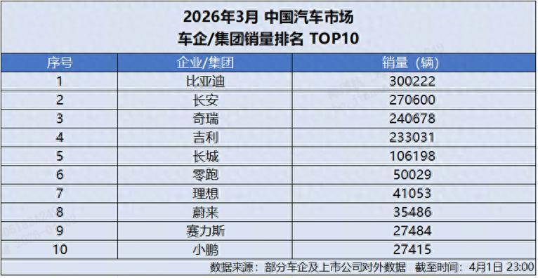 4 月 1 日,比亚迪发布 2026 年 3 月产销数据,单月总销量达300222 辆,强势突破 30 万辆大关,再添荣耀战绩,斩获中国车企销量冠军,并连续 58 个月蝉联中国新能源汽车销量冠军,持续稳固行业龙头地位。截至目前,比亚迪新能源汽车累计销量已超1580 万辆,一季度累计销售 700463 辆,以硬核数据印证技术与规模双重实力。